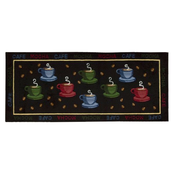 Decorate your home with a hand-made rug. The rug features a coffee cups screen-print for added style. Machine Washable. 100% Acrylic. 54 in. L x 22 in. W x 0.5 in. H. Imported.